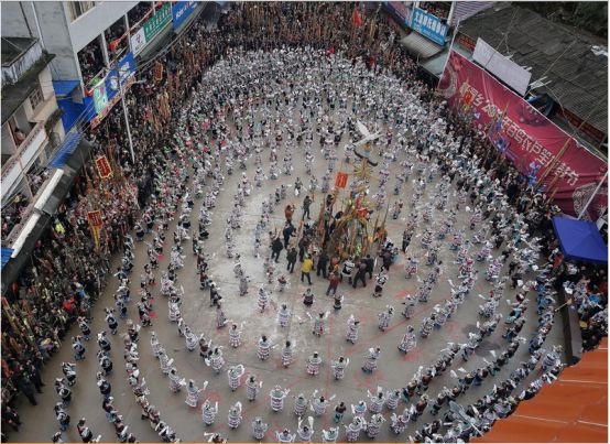 2月16日,广西柳州市融水苗族自治县杆洞乡,当地苗族芦笙队正在进行大型芦笙舞表演。