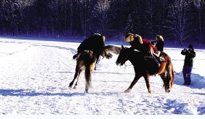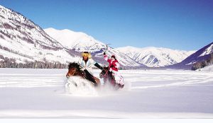 经过两个多小时的行驶,我们终于到了喀纳斯村。匆匆吃了午餐,乘车赶到赛地。站在湖面上一眼望去,封冻的湖面白雪皑皑。赛马已经开始,观赛的人不是很多,都站在一侧;远处湖心有几个骑马的人,是比赛的执裁者。过了一会,东方出现了奔马,十几个骑手策马而来,他们绕过裁判,又继续向东方驰去。大约过了10分钟,骑手们又转了回来,这时已经拉开了距离,骑手们三三两两绕过裁判继续前行。骑手们跑了三圈,赛马结束了。这次比赛,没有会标,没有仪式,没有发奖,骑手们可以尽情享受驰骋天地间的乐趣。