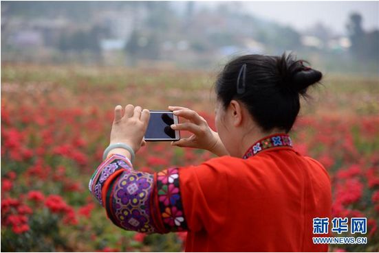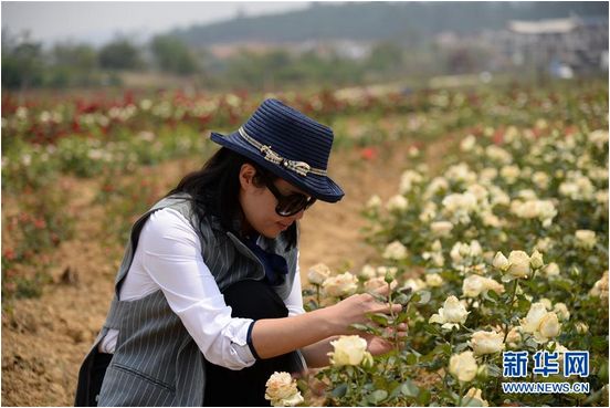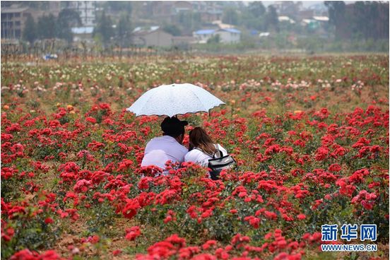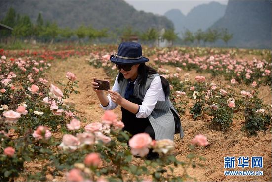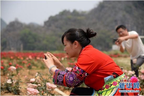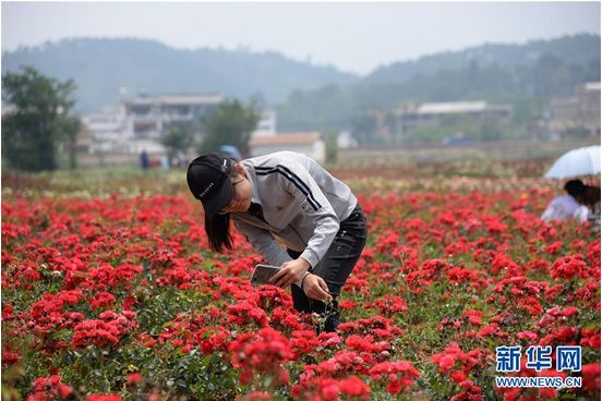 4月14日,游客在玫瑰花海中拍照留念(新华社记者 浦超/摄)
