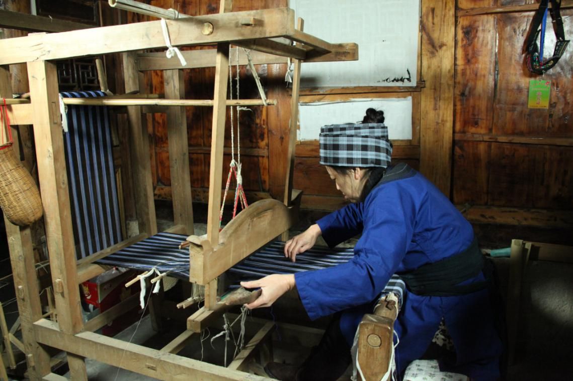 6、织布:织者坐在布床上,一手推织机,一手执梭,用脚左右踏板,左右手来回穿梭,一梭过去,一行织就。交替进行,直到布匹完成。
