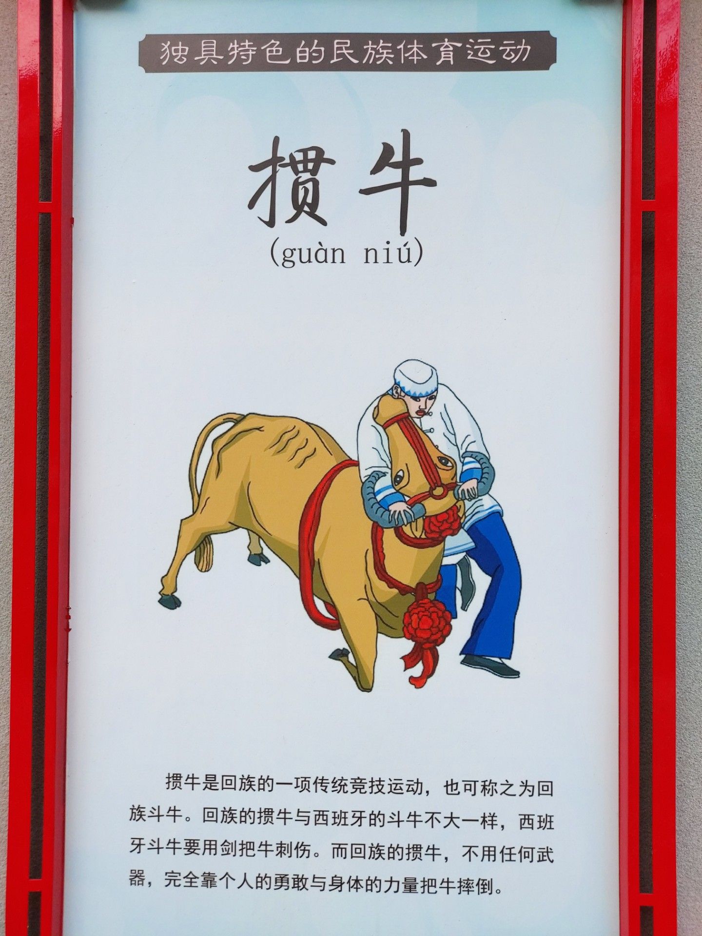 掼牛是回族的一项传统竞技运动,也可称之为回族斗牛。回族的掼牛与西班牙的斗牛不大一样,西班牙斗牛要用剑把牛刺伤。而回族的掼牛,不用任何武器,完全靠个人的勇敢与身体的力量把牛摔倒。