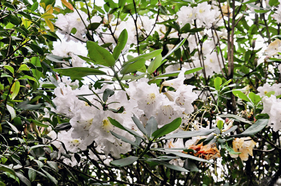 七月份的青龙山,时常笼罩在大雾里,无论在远处和近处都看不清它的真面目。不到二十分钟,上山的小路越来越陡,双腿好像绑着两块沉重的石头,实在没有力气提起来。站在盘山羊肠小道上,抬头一看,走在自己前面两米处的同志,他脚下踏着的路面高过自己的头顶。越往上看,山路越来越陡峭,有的地段根本就不是路,真想歇下,不再往上爬了。但随着海拔不断升高,杜鹃花越来越多,远处、近处,云天雾里的白色杜鹃花好比一群天鹅落满树梢,梦幻般的的美景很快让我们忘记了疲倦。靠近路边的白色杜鹃花在云雾里随风摇曳,似花非花,似雾非雾,哪儿是花,哪儿是雾,一时无法辨别。行走在密林小道上,伸手就可以采到水淋淋的白色杜鹃花。抬头仰望,密密麻麻的杜鹃花开满枝头,低头一看,树林里,小道上,洒满了杜鹃花瓣。大家都说,如此美丽的杜鹃花,只有不惧风雨和辛劳的人才能欣赏到。