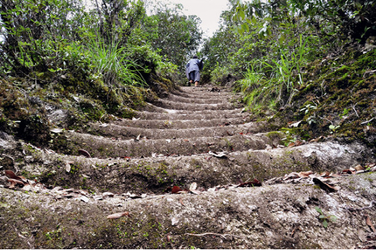 要爬上青龙山顶,必须顺着开凿在石崖上的一百六十五级天梯一步一步往上爬。由于年久失修,加之游客众多,石崖上的天梯已被踏出了缺口,台阶上布满了落叶。上天梯就不能像在家里上楼梯那样自如,每上一级,脚掌只能侧踏在台阶上,占稳了再移动。再高的山,再陡的天梯,只要有决心和信心就能够爬上去。