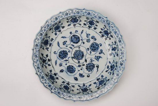 这件青花缠枝莲菱口盘是本馆传世瓷器中最为名贵的藏品之一。