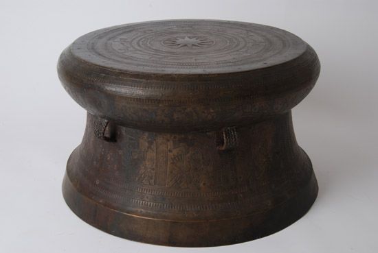 铜鼓是一种平面曲腰、中空无底的敲击体鸣乐器,流行于滇、黔、川、粤、桂、湘、琼等省区,使用于民族生活的不同领域。铜鼓由面、胸、腰、足、耳五部分组成。鼓面圆而平,是敲击发音的部分,下接鼓身,连接部分略外凸,形成球状弧度为胸。腰部略细,内收如束腰。往下鼓身又扩大,呈喇叭口部分为足。鼓身两侧各有两个半环形的耳。鼓面主体为太阳纹,周围有许多层称为“弦”的同心线条,弦数多少不等,弦与弦之间由宽窄不等的图案组成,称为晕圈。鼓身四周的表面,也有多数平行的晕圈,晕圈中铸出的纹饰图案绚丽多彩,有虫鱼、鸟兽、花卉、舟船和人物等。铜鼓制作工艺考究,用以铜为主要成分的铜、锡、铝合金等铸造而成。按不同形制和花纹,铜鼓可分为八个类型:万家坝型、石寨山型、冷水冲型、遵义型、麻江型、北流型、灵山型和西盟型。