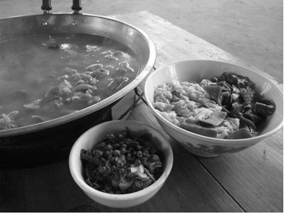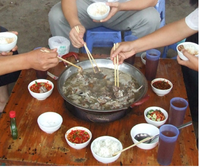中医认为:狗肉有温肾助阳,壮力气,补血脉的功效。一般人皆可食用,老年人则更佳。如今,狗肉已是马关餐厅、宾馆酒楼必不可少的美味佳肴。特别是在县城的两个农贸市场,狗肉汤锅(清汤狗肉、也称为地摊狗肉)的生意是几乎天天火爆。不仅本地人吃,而且外地游客也吃;就是外地的朋友到马关,马关的朋友都要带他们去品尝马关的名特小吃地摊狗肉。其制作工序是:挑选无病活狗,杀死后用开水烫毛脱净,用稻草、豆秆等烧狗皮至有裂痕,清水刮洗干净。开肠破肚,取出内脏用清水洗净。将狗肉砍成大块或整个放于大锅内煮熟,再取出切成小块,用原汁原味的狗肉清汤置于火锅内,配上草果、八角、大蒜、柑橘叶子等佐料煮沸,再加上特制的蘸水(糊辣椒面、花椒、薄荷、芳香油、大蒜等佐料),即可食用。