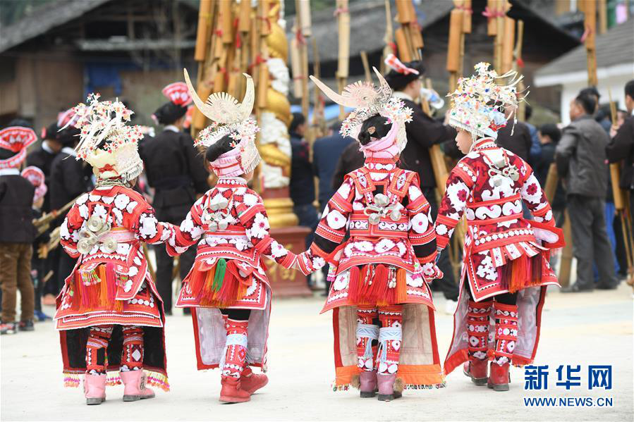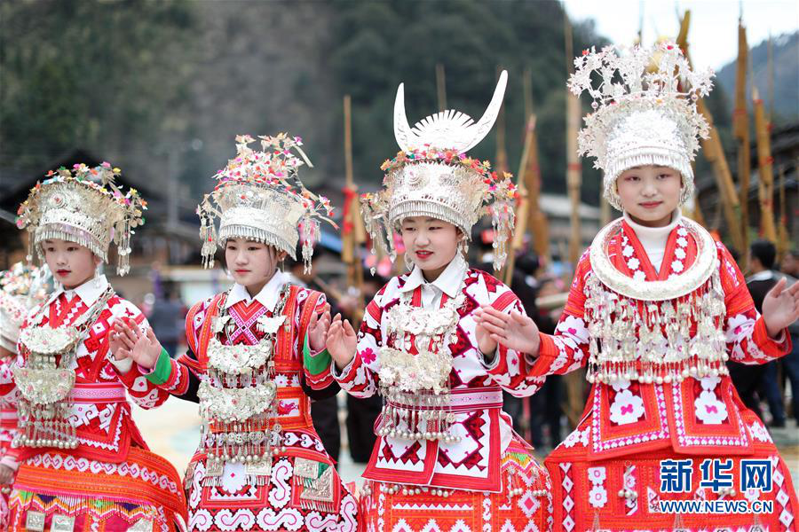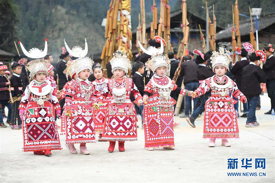 2月11日,在贵州省榕江县朗洞镇岑最村,苗族小姑娘在跳芦笙舞。