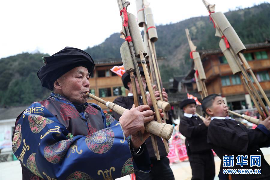 2月11日,在贵州省榕江县朗洞镇岑最村,苗族同胞在吹芦笙。