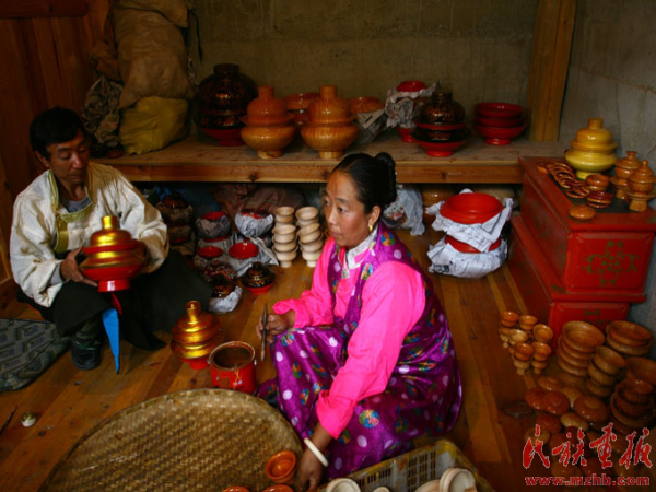 廖文华告诉我们,成品木碗从开始到制作完成需要晾干、做毛坯、水煮、修整成型、上漆、绘图等十二道工序,木碗一般选用桐树、桑树、桦树的树干、树节、树疙瘩等材料经过刮制或车削而成。这些木材做成的木碗质地坚硬,碗面光滑,纹路清晰,可以长时间不变形、不破裂。木碗的品种繁多,有藏桌、糌粑盒、辣子盒、酥油茶杯、木碗等。近年来旅游业发展了,因而又根据游客的需要新研制了鼻烟壶、手镯、茶碗、茶叶盒等旅游工艺品。