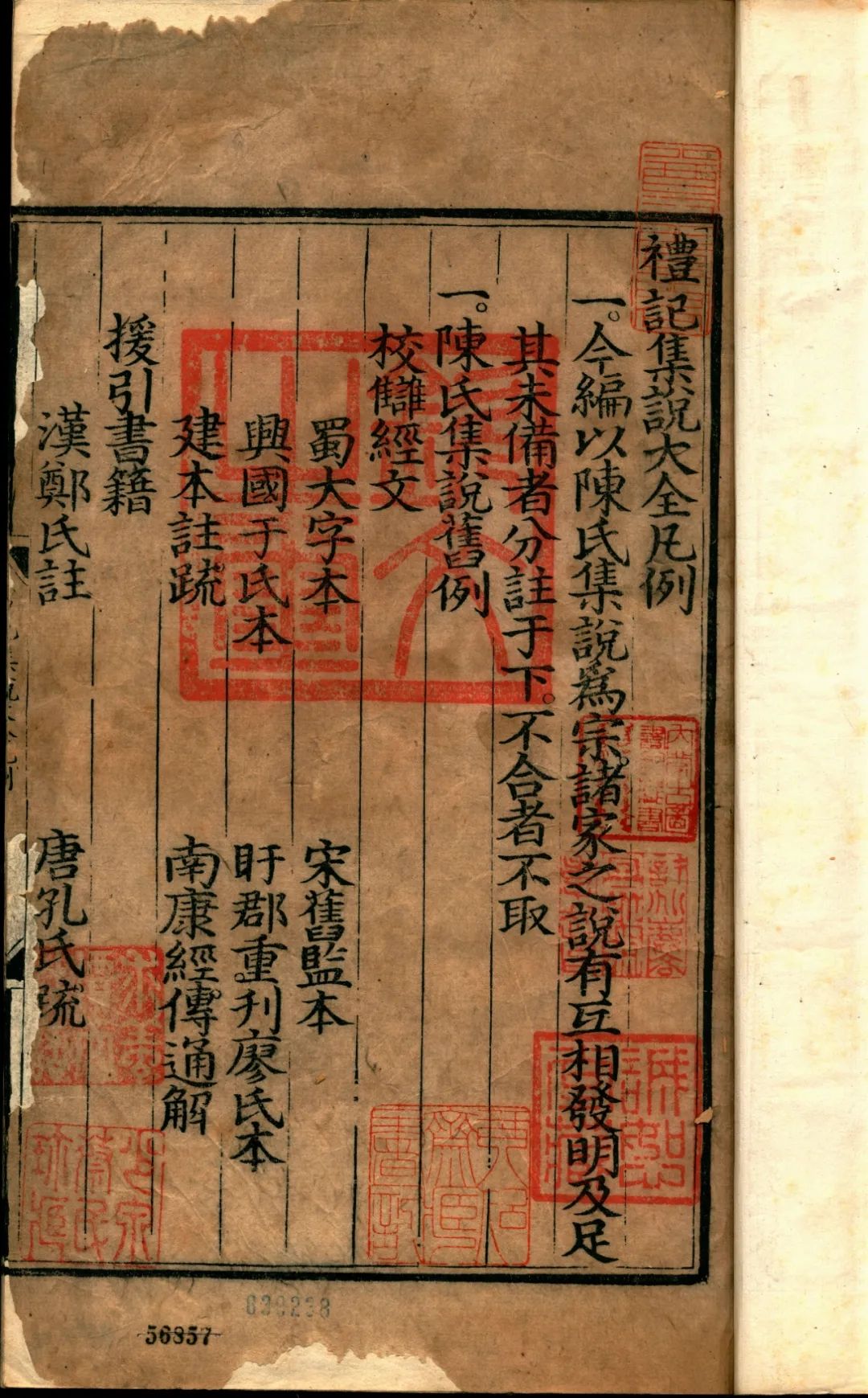 内蒙古自治区图书馆藏《礼记集说大全》三十卷,明胡广等纂修,明内府刻本。十八册。版框高二十七点二厘米,宽十七点八厘米;开本高三十四点五厘米,宽二十厘米。半叶十行行二十二字,小字双行同。黑口,四周双边,双对黑鱼尾,鱼尾中刻书名、卷次、页码。卷前缺失内封、牌记,存凡例、总论、陈澔序。每册首页钤印多寡不等,凡例首页钤印依次有阳文方印“诚恕堂藏”、“琴侣斋藏书记”、“少泉蔡氏珍藏”、“求善价尔沽诸”、“钦文之玺”,阳文长方印“尊闻阁”等。