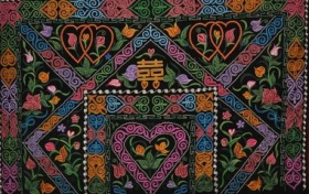 哈萨克族姑娘出嫁时,花毡壁挂是必备的嫁妆,而且新娘要亲手编制。她们挑选自己最喜爱的花卉图案绣在上面,而且配上相应的花边图案,图案周围镶上金丝,缀上银珠,这些图案和装饰承载了新娘的爱和情,工艺精良典雅,画面光艳照人,是很有欣赏价值的装饰品。