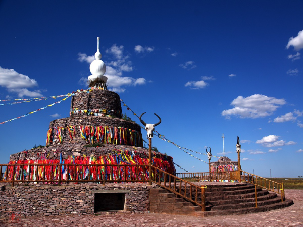 敖包是蒙古语,意为堆子或鼓包。祭敖包蒙古民族盛大的祭祀活动之一。敖包通常设在高山或丘陵上,用石头堆成一座圆锥形的实心塔,顶端插着一根长杆,杆头上系着牲畜毛角和经文布条,四面放着烧柏香的垫石;在敖包旁还插满树枝,供有整羊、马奶酒、黄油和奶酪等等。祭祀时,在古代,由萨满教巫师击鼓念咒,膜拜祈祷;在近代,由喇嘛焚香点火,颂词念经。牧民们都围绕着敖包,从左向右转三遭,求神降福。