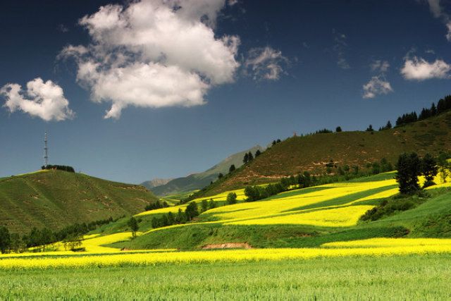 站在鹞子沟高高的观景塔上极目四望,北部的祁连雪山一线,逶迤天际,晴岚上浮,光艳飘逸。南边远望互助川谷,平川沃野间农田与村庄阡陌纵横,花团锦簇,色彩斑斓。南门峡水库,远远看去就像是一颗翠绿的宝石一样,镶嵌在遍地黄花之中。回眸大通县境,西面是高高耸立的娘娘山山峰。周围高高低低的峰峦,历历在目。俯视眼前的东峡谷,一条河流像玉带一样,拦腰绕山向西而去。层层麦田和油菜花,流光溢彩。鹞子沟群峰竞秀,松峻迭翠。达坂山积雪映照着东峡川。凭栏看山中云蒸霞蔚,云来云去,远近平山出没其间。阁楼就像浮在瀛海蓬莱仙岛之上,恍如仙境一般。秋阳艳丽,纤尘不染,天空高远。夕阳西下时,霞光万道,俊峰秀山披上了金光闪闪的外衣。