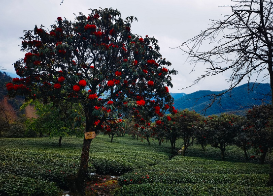 正是山花将闹时,浓浓淡淡未离披。映山红与茶相恋,挽住游人赠一枝!